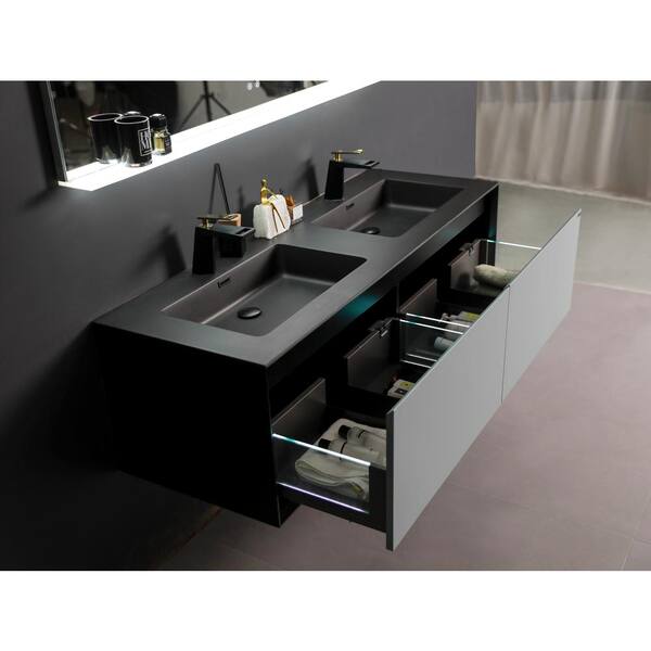 59.1 in. W x 20.7 in. D x 17.9 in. H Floating Bath Vanity in Armani Grey with 2 Sinks Matt Black Solid Surface Top