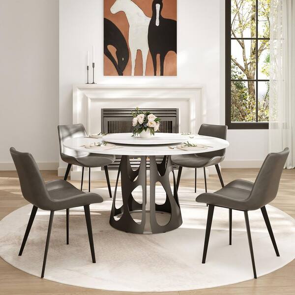 59 in. White Lazy Susan Sintered Stone Tabletop with Black Pedestal Base Dining Table (Seats-8)