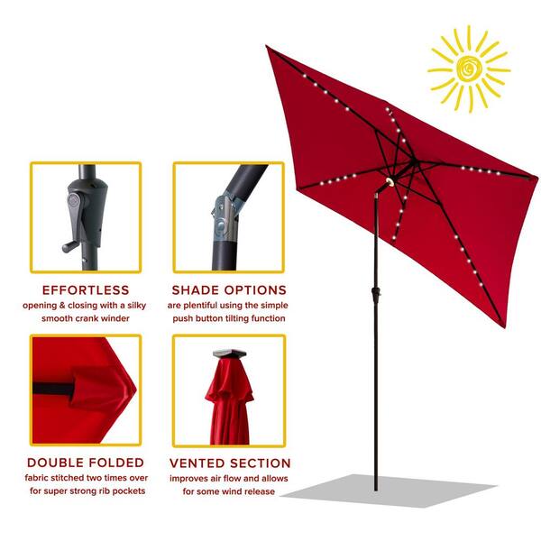 6-1/2 in. x 10 ft. Rectangle Aluminum Market Solar LED Lighted Tilt Patio Umbrella in Red Solution Dyed Polyester