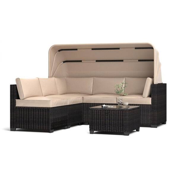 6-Piece Black Brown Wicker Outdoor Sectional Sofa with Khaki Cushions, Canopy and Lifting Table