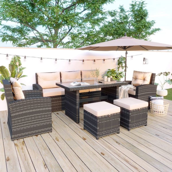 6-Piece Black Wicker Patio Conversation Seating Set with Brown Cushions