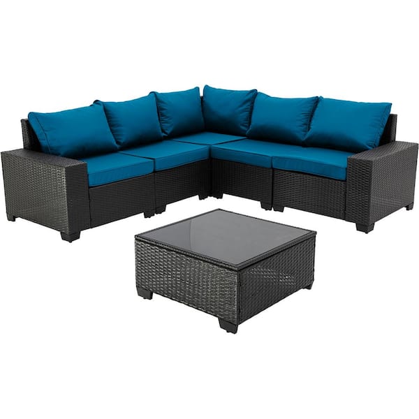 6-Piece Dark Coffee Wicker Outdoor Sectional Sofa Set with Peacock Blue Cushions for Garden, Backyard