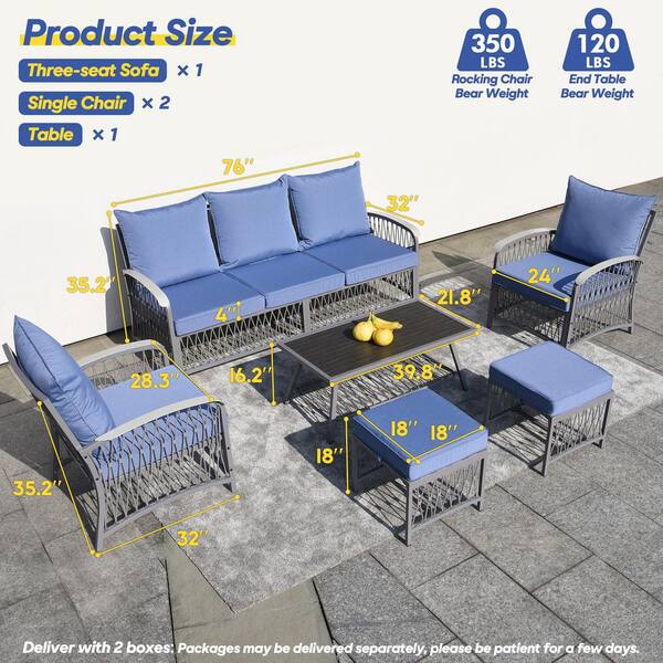 6-Piece Gray Metal Patio Conversation Set with Blue Thick Cushions, Ottomans and Table