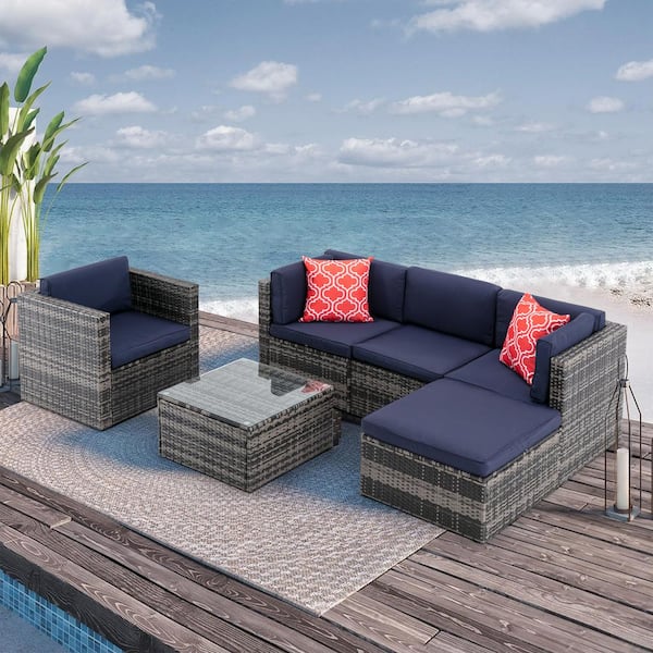 6-Piece Gray Mix Wicker Patio Conversation Sectional Seating Set with Navy Blue Cushions Glass Table and Red Pillows