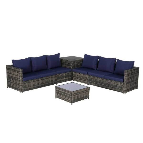 6-Piece Gray Wicker Patio Conversation Set with Dark Blue Cushions, Corner table & Glass Top Table