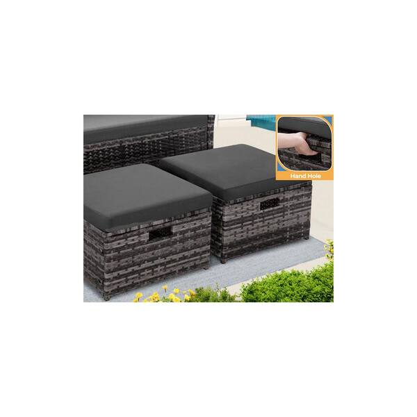 6-Piece Grey Rattan Wicker Patio Outdoor Sectional Set Furniture Sofa with Grey Cushions, 2-Ottomans and Coffee Table