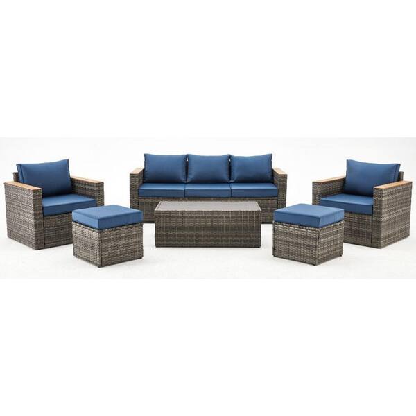 6-Piece Grey Wicker and Steel Frame Outdoor Patio Sectional Sofa Sets with Blue Cushions for Backyard, Lawn