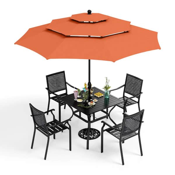 6-Piece Metal Patio Outdoor Dining Set with Square Table and Red Orange Umbrella