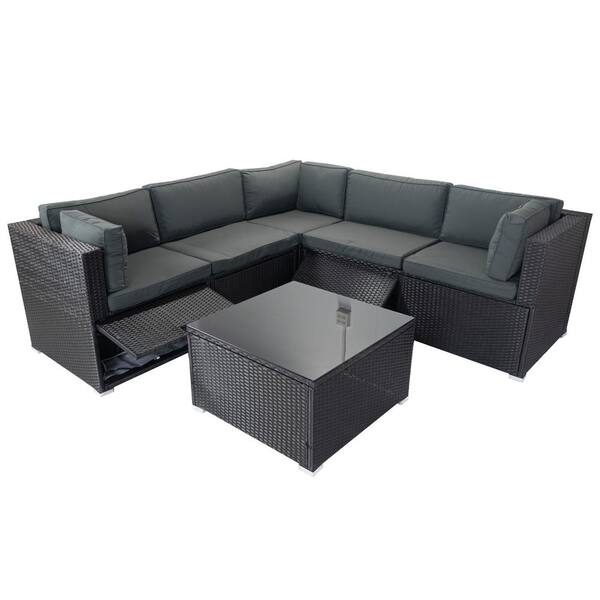 6-Piece PE Wicker Rattan Outdoor Sectional Cushioned Sofa Set with 3 Storage Under Seats and Dark Grey Cushion