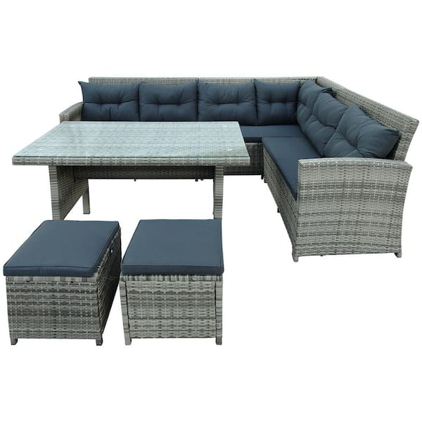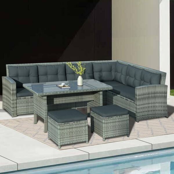 6-Piece Rattan Gray Wicker Outdoor Sectional Set with Gray Cushion Table Ottoman