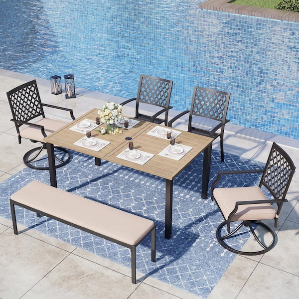 6-Piece Rectangular Outdoor Dining Set with Brown Slat Table and Bench with Beige Cushion