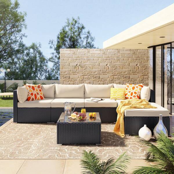 6-Piece Wicker Outdoor L-shape Sectional Sofa Set Patio Furniture Conversation Set with Table and Ottoman, Beige Cushion