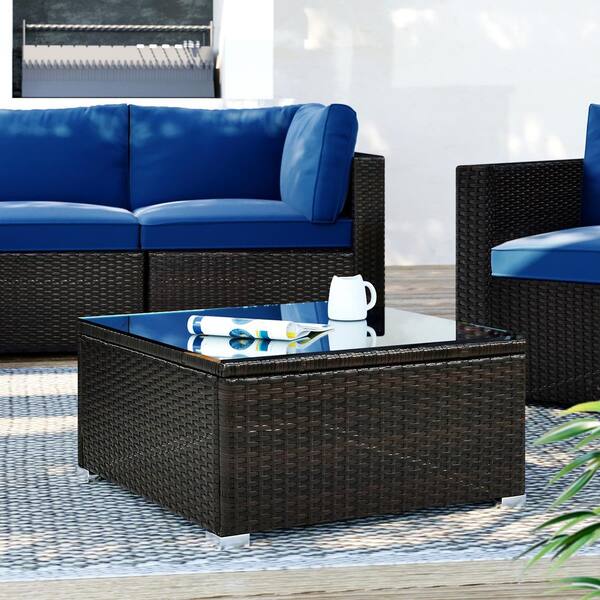 6-Piece Wicker Outdoor Patio Sectional Set All Weather Rattan Sofa Set with Glass Table, Blue Cushion Plus Brown Wicker
