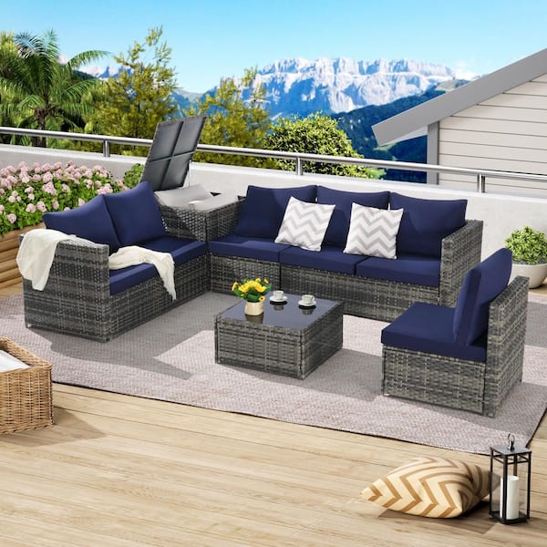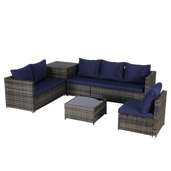 6-Piece Wicker Outdoor Sectional Set with Dark Blue Cushions and Coffee Table
