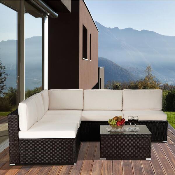 6-Piece Wicker Patio Conversation Sectional Seating Set with Beige Cushion
