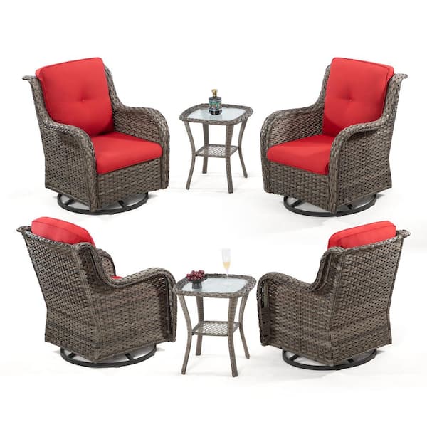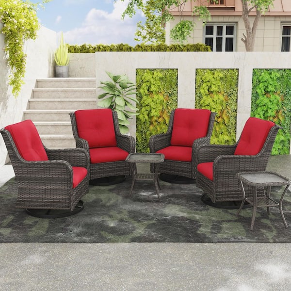 6-Piece Wicker Patio Conversation Set All-Weather Swivel Rocking Chairs Set with Red Cushions and Side Table
