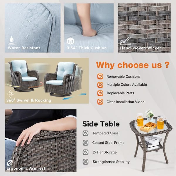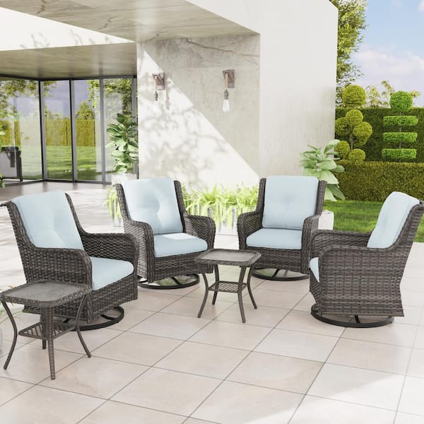6-Piece Wicker Patio Conversation Set with All-Weather Swivel Rocking Chairs Baby Blue Cushions