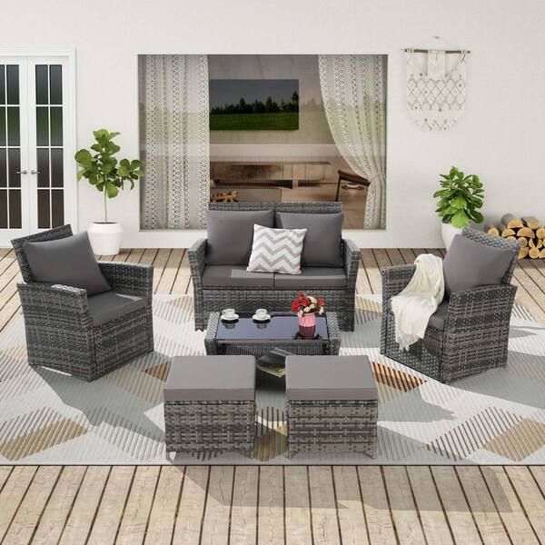 6-Piece Wicker Patio Conversation Set with Dark Gray Cushions, Outdoor Sectional Patio Furniture with Ottoman and Table