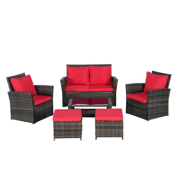 6-Piece Wicker Patio Furniture Set with Ottoman and Tempered Glass Coffee Table, Water-Resistant Cushions, Red Cushion