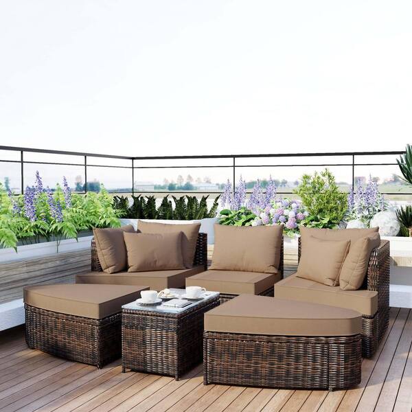 6-Piece Wicker Patio Outdoor Conversation Round Sofa Set with Brown Cushions and Coffee Table for Balcony