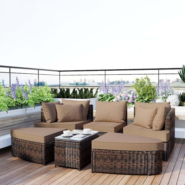 6-Piece Wicker Patio Outdoor Conversation Round Sofa Set with Brown Cushions and Coffee Table for Poolside
