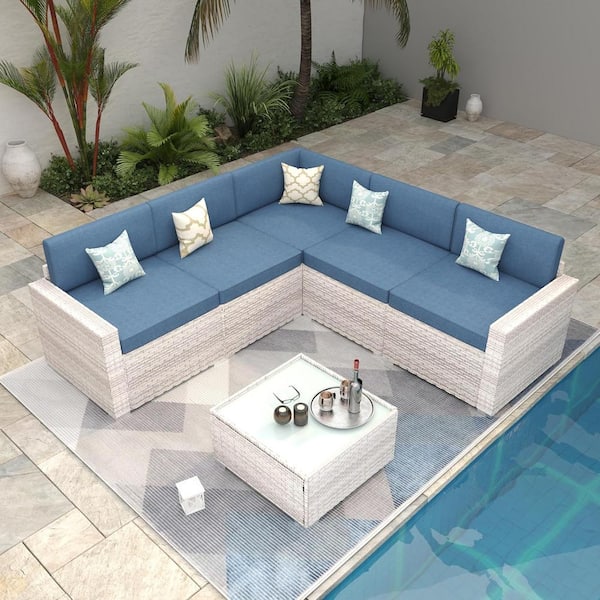6-Piece Wicker Rattan Outdoor Patio Conversation Set with Blue Cushions and Double-Sided Coffee Table