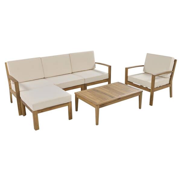 6-Piece Wood Outdoor Sectional Set with Coffee Table and Removable Beige Cushions for Garden Backyard and Poolside