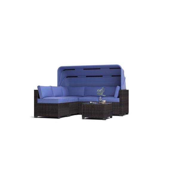 6 Pieces Wicker Patio Conversation Set with Retractable Canopy Outdoor Adjustable Backrest Blue Cushions