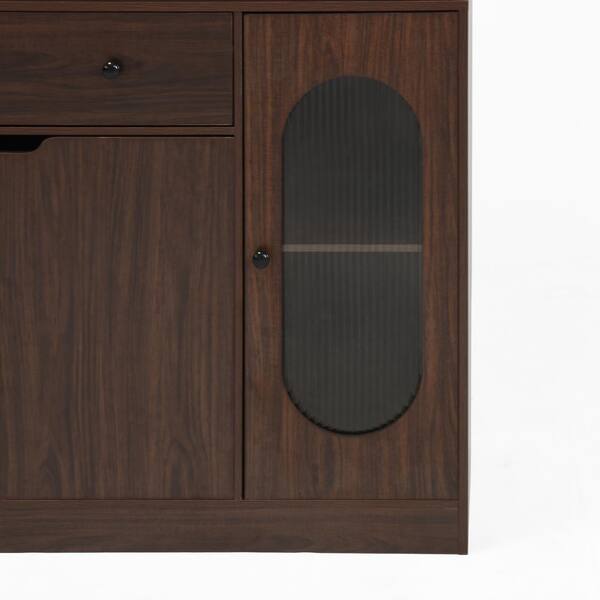 6-Shelf Walnut Wood 71 in. Tall Pantry Organizer with Roll-Out Drawers and Reeded Glass Doors