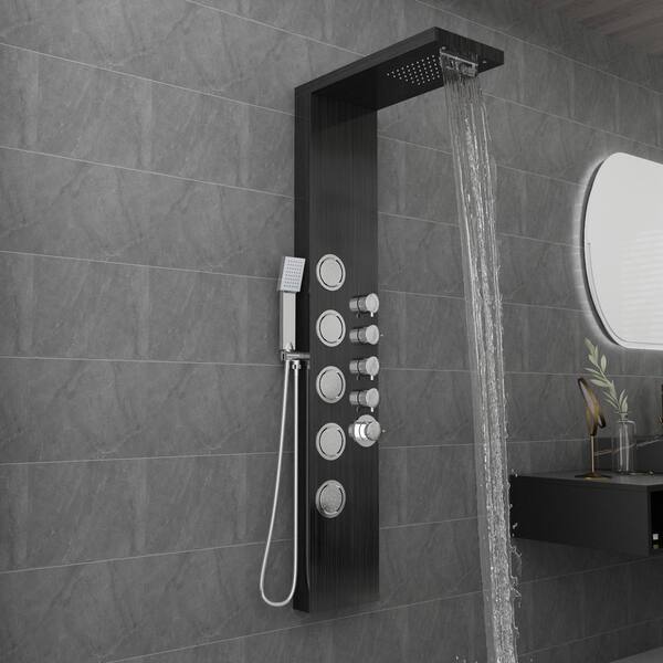 6-Spray, 5 Body Jets Stainless Steel Shower Tower with Rainfall Waterfall Shower Head, Hand Shower in Black, Valve