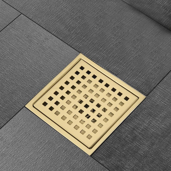 6 in. L x 6 in. W x 2.3 in. H Square Stainless Steel Shower Floor Drain Shower/Tub Hardware with Base Flange in Gold
