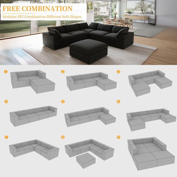 6-piece Modular 120.5 in. Deep Seat Linen Sectional Sofa with Storage and Removable Covers, Cushions in. Black 7-Seater