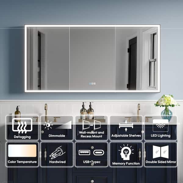 60.01 in. W x 30 in. H Rectangular Black Aluminum Recessed/Surface Mount LED Medicine Cabinet with Mirror, Night Light