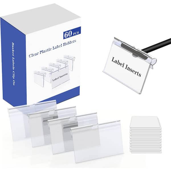 60-Piece Clear Plastic Clip On Storage Bin Labels with 80-Blank Papers for Wire Shelf Baskets Pantry Cubes