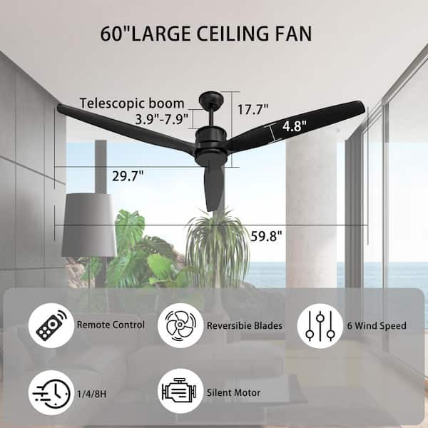 60 in. Ceiling Fans Black Indoor/Outdoor Use 3 Wooden Blade Propeller with Remote Control, DC Motor, 6-Speed Adjustable