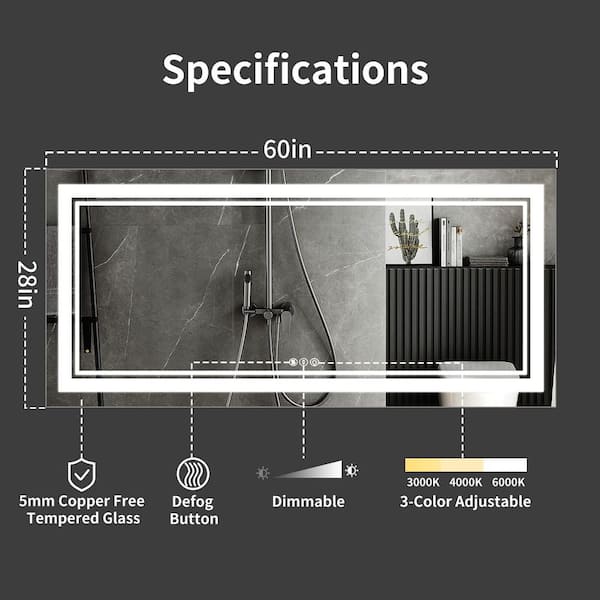 60 in. W x 28 in. H Rectangular Frameless LED Wall Mount Anti-Fog Modern Decorative Bathroom Vanity Mirror