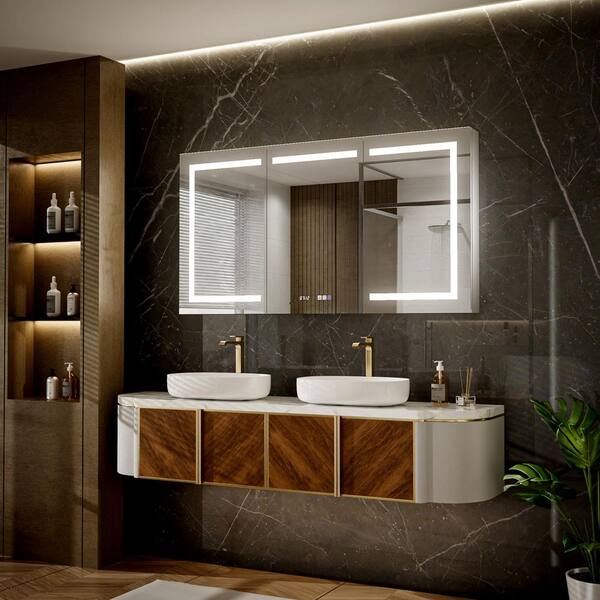 60 in. W x 32 in. H Rectangular Silver Aluminum Recessed/Surface Mount Medicine Cabinet with Mirror LED and Clock
