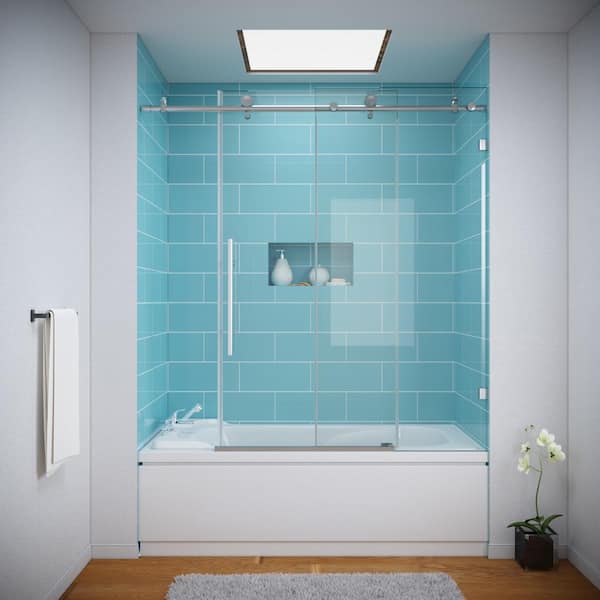 60 in. W x 62 in. H Sliding Frameless Tub Door in Brushed Nickel Finish with Clear Glass