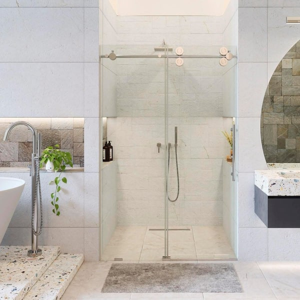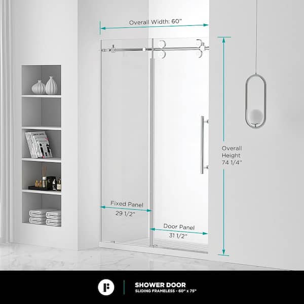 60 in. W x 74.5 in. H Sliding Frameless Shower Door in Satin Nickel Finish with Tempered Clear Glass