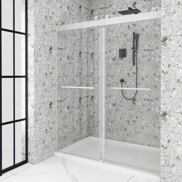 60 in. W x 76 in. H Double Sliding Frameless Shower Door in Brushed Nickel with Buffer