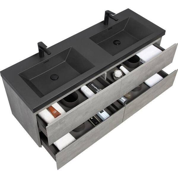 60 in. Wall-Mounted Grey Bath Vanity with Black Solid Surface Top Unassembled