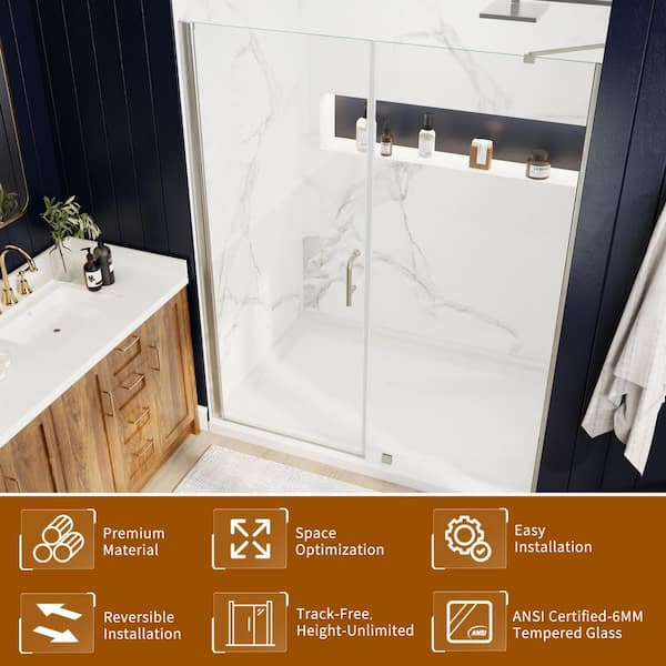60 in. to 60 9/16 in. x 72 in. Frameless Pivoting Shower Door in Brushed Nickel with Clear Glass