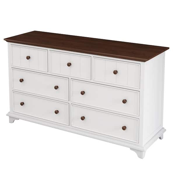61 in. W x 19.7 in. D x 34.8 in. H White Wood Linen Cabinet with 7-Drawer Dresser and Walnut Top