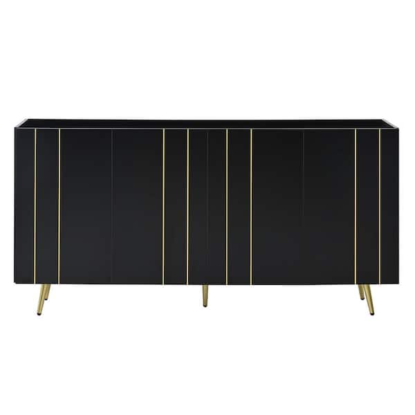 62.9 in. W x 14.9 in. D x 31.4 in. H Black Wood Linen Cabinet with 5 Metal Legs, 4 Adjustable Shelves, Gold Lines Doors