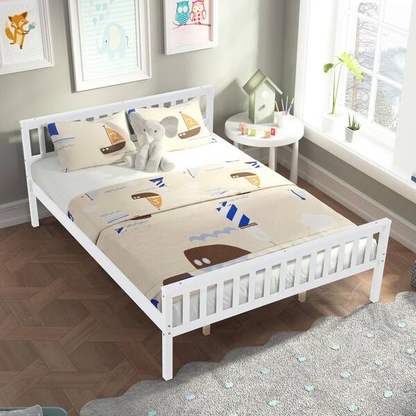 63.86 in. W White Wood Frame Queen Size Platform Bed Frame with Wood Slat Support, Slatted Headboard and Food board
