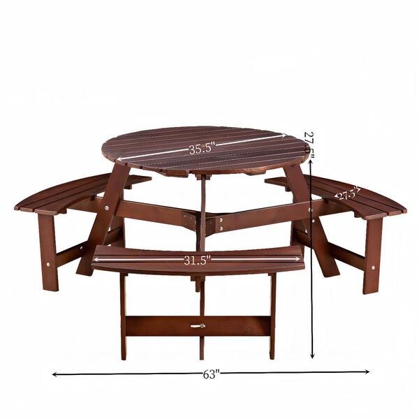 63 in. Brown 6 person Round Wood Picnic Table with 3 Built-in Benches, Umbrella Hole