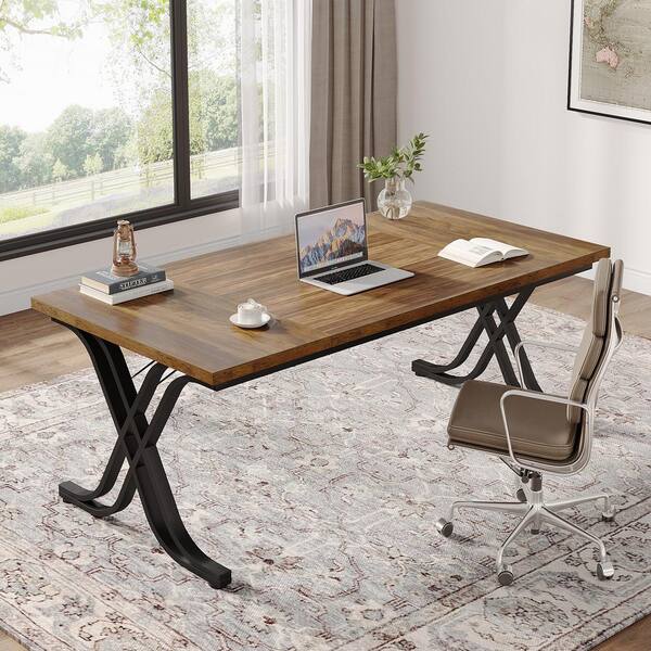 63 in. Rectangular Brown Executive Desk, Computer Desk with Thick Wooden Tabletop Metal Frame for Home Office