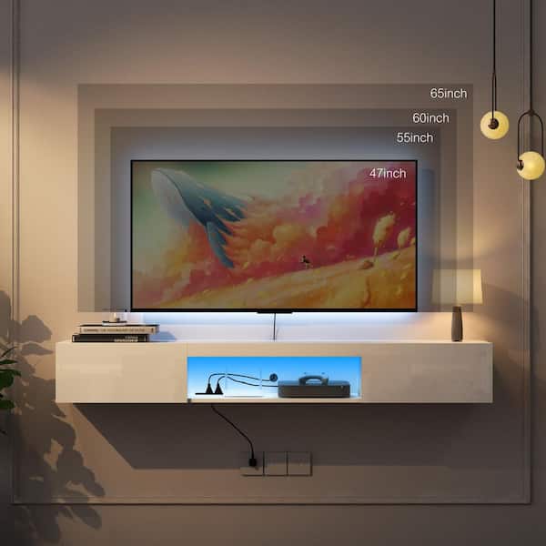 63 in. W x 12.2 in. D White MDF Decorative Wall Shelf Wall Mounted TV Stand Floating TV Cabinet with Led Lights