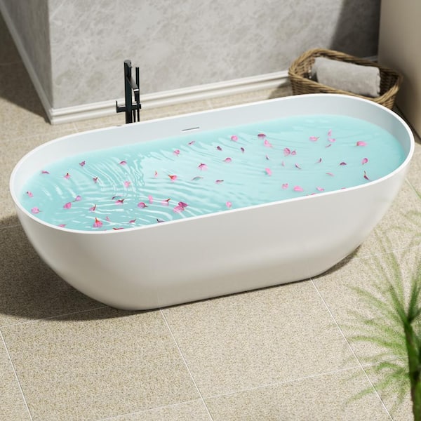 63 in. x 30 in. Freestanding Soaking Synthetic Stone Bathtub with Center Drain in Sleek White