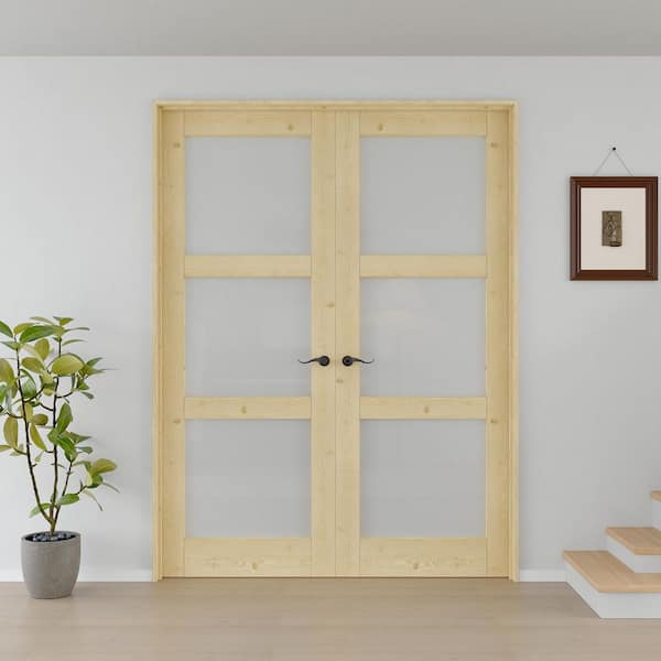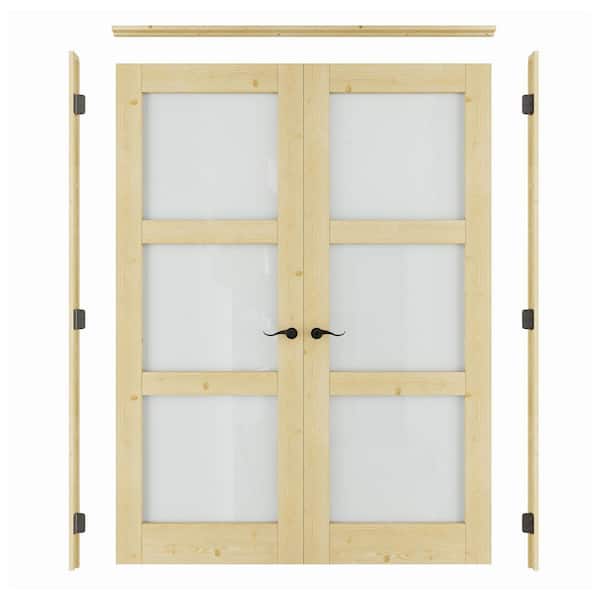 64 in. x 80 in. Universal 3-Lite Frosted Glass Unfinished Pine Wood Double Prehung French Door with Quick Assemble Jamb